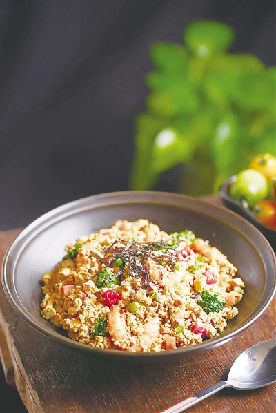 4、锅中倒入半勺橄榄油,倒入豆腐鸡蛋,将其炒松散,加入1勺生抽,1勺蚝油翻炒均匀。