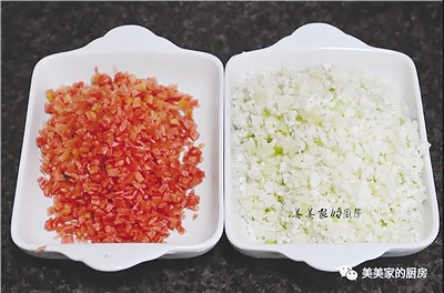 2、花菜放入淡盐水中浸泡5分钟,沥干切碎。胡萝卜切丁备用。(用花菜代替米饭,既有炒饭的口感,热量还更低,减肥也可以放开吃)