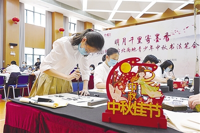 9月17日下午,在徐汇中学,来自徐汇、台北两地10所学校的师生在中秋佳节来临之际,通过云端视频连线的方式,以书画会友、以笔墨传情,用书法雅集的形式共庆中秋,书写团圆诗篇。笔会现场,两地徐汇中学和结对姐妹学校的校长互相问候,交流联络。两地的二十多位中小学生现场书写中秋诗文,交流书艺。朱亮 摄影报道