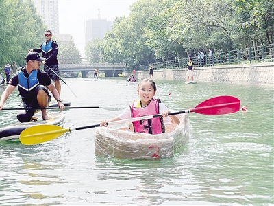 来自辖区的企业代表用环保材料制作出一艘艘各式各样充满创意的“战舰”。随着“战舰”逐一下水,上澳塘里水花四射,百舸争流。居民区的护河志愿者们则带着自己的孩子,仅仅用纸板就做出了一艘艘简易的小船,孩子们掌握着平衡,小心翼翼地驾驶着纸板小船,荡漾在清清的小河上,恰似一幅人与自然的和谐画卷。