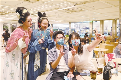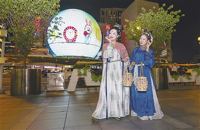 9月20日至21日晚,市民游客在美罗城邂逅汉服小姐姐,与他们合影留念,获取《桂花宝典》。位于徐家汇核心商圈的美罗城,集文化娱乐、时尚购物、休闲美食为一体,备受年轻人喜爱。直径41.2米的巨型“水晶球”极具辨识性,中秋节当晚,一轮“明月”升起于此,更有一曲汉舞快闪,婉约古韵让人驻足。
