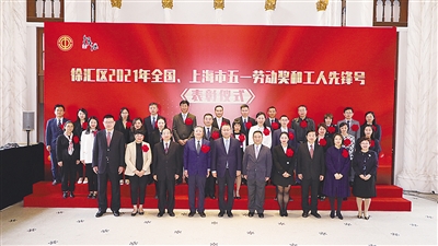 本报讯 10月25日下午,徐汇区2021年全国、上海市“五一劳动奖”和“工人先锋号”获奖集体和个人表彰仪式在区政府汇展示厅举行。区委书记曹立强,区委副书记、区长钟晓咏,区人大常委会主任李新华,区政协主席胡敏,区委副书记沈权,区人大常委会副主任、总工会主席朱伟红出席仪式。