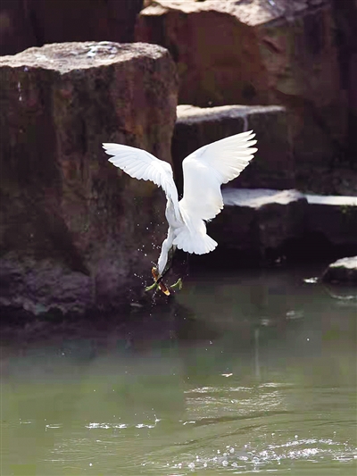 在桥畔亭前僻静处守候拍鸟的摄影爱好者黄先生告诉记者,自从造了这片湿地后,生态环境明显改变,“鸟、白鹭,经常来的,我基本上在10点到11点半这段时间到这里拍摄,光线好的时候,把白鹭捕食的光影和翅膀都能拍出来。”不去惊扰这些大自然的精灵,静静地守候记录,黄先生怡然自得。