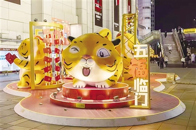 在去年迎新时,上海六百广场上的五牛雕塑红极一时,如今已被今年新来的五只憨态可掬的生肖萌虎所取代(如图 资料),它们有的正在拱手作揖,向往来市民祝福、拜年;有的好似大橘猫,或伸着懒腰,或盯着毛线球发呆;有的正在派发红包,为新年带来吉祥如意。凭借谐音“五虎”,寓意着新年“五福临门”的愿景。许多逛街的过路市民纷纷上前合影留念,为新年讨个吉利。