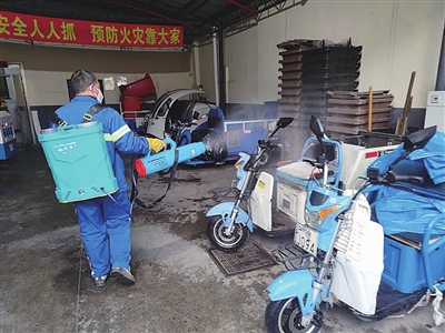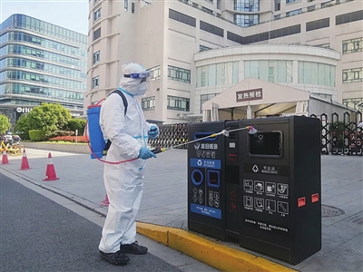 每日对沿街废物箱进行至少两次的消毒作业,对接触生活垃圾的部位强化喷洒消毒。