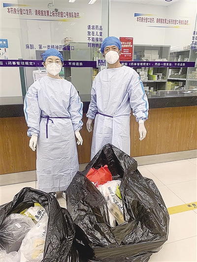 第二天,配药小分队带好大大小小各种袋子再次前往龙华医院。小分队先在付费处付昨天开药的费用,结束后马上去取药处。队员们在医院一站又是大半天。到了傍晚时分,药终于取完。为了方便发药,小分队在领药窗口手不停,按户按楼栋装好,并做好编号。思想高度集中,忙而不乱。最后看到两大袋为居民配好的紧急药品,小分队的同志们脸上都露出了胜利的笑容。大家扛着“战利品”赶回小区。