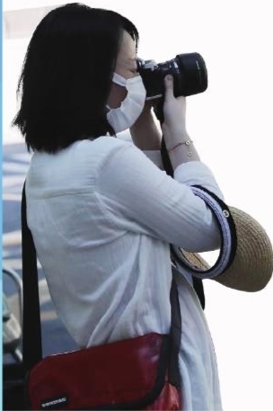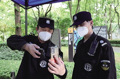 (3) 5月23日,在徐家汇公园,保安队长王文文(左)正在给队员讲解“数字哨兵”的正确使用方法。