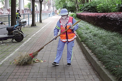 (2) 5月22日,在上中路街头,一位清洁工人正在打扫卫生。