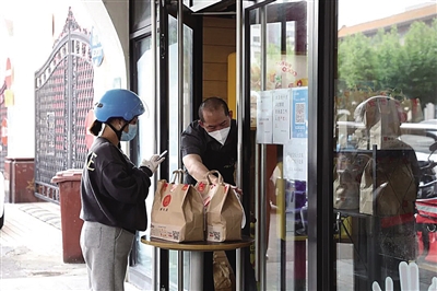 (4) 一名快递员正在徐家汇一商家门前取快递