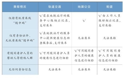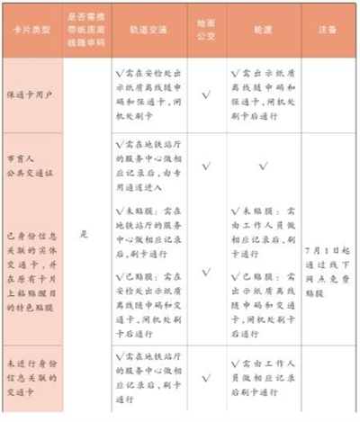 持实体交通卡(已与身份信息关联)+纸质离线随申码,可乘坐轨道交通、地面公交、轮渡。