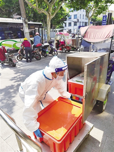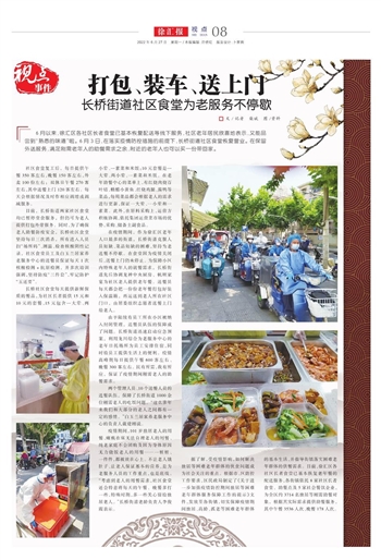 在疫情期间,作为徐汇区老年人口最多的街道,长桥街道克服人员短缺、菜品短缺的困难,坚持为老送餐不停歇。在食堂因为疫情关闭后,送餐上门仍未停止。为保障小区内特殊老年人的就餐需求,长桥街道先后协调龙神中央厨房、帆顺家宴为社区老人提供老年餐。送餐员每天都会把一份份老年餐打包好装入保温箱,再运送到老人所在社区门口,由居委组织志愿者送餐上门给老人。