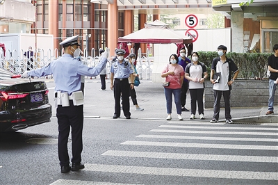 考试期间,护考警力积极引导送考家长在校门口不聚集、不滞留,同时,也因天气炎热,提前协调了考点属地街镇,落实室内休息点,供送考家长在考试期间临时休息。考虑到今年高考要求检验考生核酸检测情况,考生可能提前到考点,徐汇交警和治安护考警力提前2小时就已上岗。