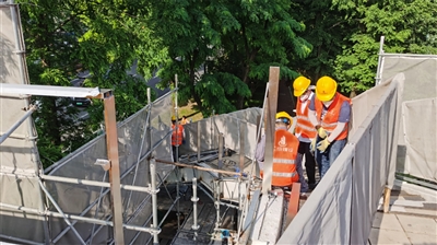 在宛平南路天桥加装电梯项目现场,相关施工已全面铺开。作为2022年徐汇区重大民生项目,宛平南路天桥加梯工程在4月前已完成了天桥电动扶梯基础、钢立柱基础、钢楼梯基础的浇筑以及北侧钢楼梯的安装,还同步完成了肇嘉浜路宛平路西北侧的样洞开挖、绿化搬迁、电力管线保护、围挡安装、脚手架搭设、信息管线搬迁以及通行步道施工,原有桥体装饰面板及其配套龙骨也完成更换,对原有钢结构进行了除锈油漆涂刷。