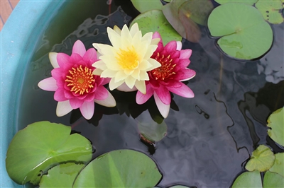 7月2日清晨,我发现在直径70厘米、高40厘米的大缸里,漂浮着巨大莲叶的水面出现了一个“蒂”上同时结出三朵花色不相同、都绚烂多姿的“三并蒂”。令人称奇的是这三朵莲花的花芯各有特色。这三朵花的花芯颜色分别是紫色、黄色和奶黄色的。这三朵主色调不尽相同的“同胞之花” 组合在一起真是天造地设,顶级的般配,超级的和谐。
