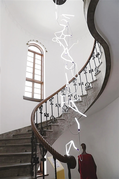 ①展出的灯光装置作品《星座》;②展出的作品《身体缓冲器》,创作于疫情期间,由于无法购买原定材料,设计师悉麓决定使用再生材料制作。作品意在表达服装在生活中扮演缓冲器的角色 刘晓晶 摄影报道
