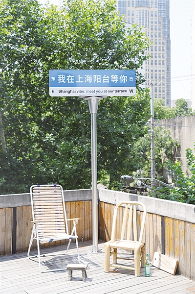 在巧克力特的理想空间中,“我在上海阳台等你”的路牌是具有标志性的物体。它高高地立在三楼阳台上,向所有经过的路人发出邀请,我在等你。巧克力特说,路牌的英文是Shanghai vibe:meet you at our terrace,这句话不只是对话上海人,而是面向所有人。