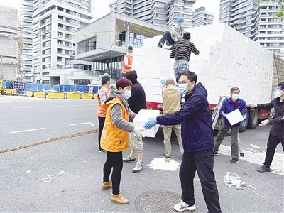 一场一场的协调沟通会把每幢楼里居民的心凝在了一起,这股“邻”聚力在三月疫情突然袭来时更是发挥了极大的作用。在小区封控期间,越来越多的“新面孔”走出家门,成为了小区的志愿者。他们接起了物资运输“最后一百米”的接力棒,成为随时接单冲刺跑的楼栋快递“小哥”,为了把物资及时送到居民家门口,日复一日地进行着“最后一百米”的来回奔波;他们配合居委制定了小区的团购管理办法,在实践过程中不断完善优化,明确了必需品的范围,向居民和团长们做好解释工作;他们在协助居委干部、医护人员和核酸点位上扫码、维护队伍秩序之间往复,现场帮助老人解决核酸码过期等实际操作问题。