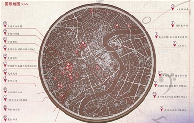 记者在百代小楼的二楼看到,西侧墙上张贴着一幅国歌地图,上面标注着《风云儿女》开拍地、百代小楼、田汉寓所、聂耳旧居、夏衍旧居、国歌展示馆、黄浦剧场等20个与《义勇军进行曲》创作息息相关的点位,涉及徐汇、杨浦、黄浦、静安、虹口等多个区。经过考证,国歌的灌制地、唱响均发生在上海,看似偶然,其实却是必然。当时的上海尤其是徐汇,云集了众多左翼文艺工作者,无论是电影《风云儿女》、还是国歌的创作,都是当时民族精神的真实展现。