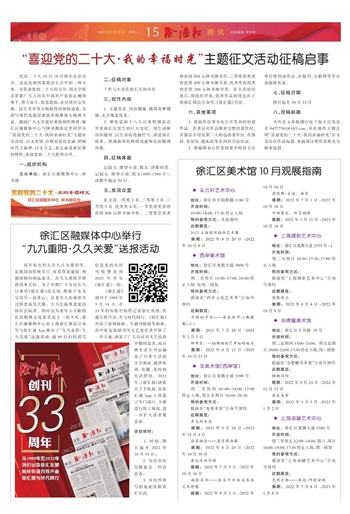 《徐汇报》创刊于1989年3月14日,在33年的历程中始终记录徐汇发展,传递百姓声音,并与时代同行。《徐汇报》开设了新闻版面、专副刊版面等版面,其中桂花苑副刊为文艺爱好者开辟了一片天地,满足了广大市民对文艺孜孜不倦的追求,而百姓生活专刊也涵盖了日常生活的方方面面,提供有效、有趣、及时的生活资讯。2021年,《徐汇报》还推出了手机报,在徐汇通App上设置了专门端口,方便进行线上阅读,进一步扩大读者覆盖面。