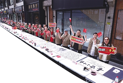 徐汇区书画协会副会长沈爱良介绍,建党百年时他们曾设想创作一幅百米长卷,因疫情原因没有做成,此次10位书法家、10位画家,共同完成红色主题的这样一个作品,向党献礼、向二十大献礼,也了却了大家的一个心愿。