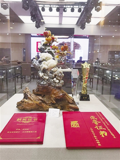 在现场,寿山石“百子贺寿”“龙凤呈祥”“傲骨寒香”“花开富贵”摆件、老挝石“老子出观”“指日高升”摆件、翡翠“丹道鼎元”“招财纳福”“迎客松”摆件等,可谓佳作云集、种类繁多。许多玉石爱好者纷纷前来赏玩交流。