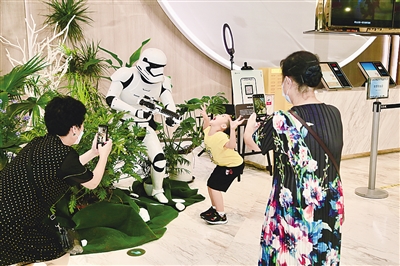 国庆节下午2点左右,位于徐家汇的港汇广场6楼永华影院人头攒动。与以往不同的是,在影院南侧近百平方米的会客厅里,跃然竖起“绿野仙踪”景点,只见《星球大战》里的两位白兵手执激光枪穿梭其间,加上左上侧白炽灯光影,宛如置身丛林之中。不多时,一个三口之家中的小女孩面对白兵,举起双手,伸了下舌头,作投降状,一旁母亲咔嚓按下了快门。