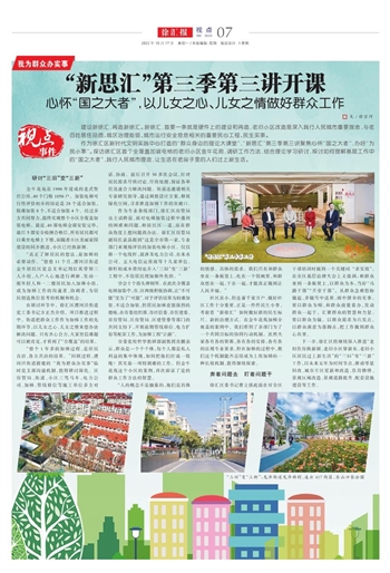 作为徐汇区新时代文明实践中心打造的“群众身边的理论大课堂”,“新思汇”第三季第三讲聚焦心怀“国之大者”,办好“为民小事”。探访徐汇区首个全覆盖加装电梯的老旧小区金牛花苑,调研工作方法,结合理论学习研讨,探讨如何理解基层工作中的“国之大者”,践行人民城市理念,让生活在老房子里的人们过上新生活。