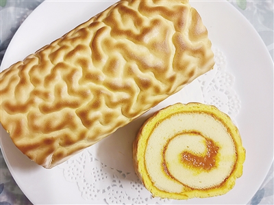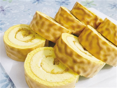 步骤3:虎皮蛋糕卷制:在虎皮反面抹上一层薄薄的夹馅料;将蛋糕坯放在虎皮上粘合;在蛋糕坯表面抹上夹馅;借助擀面杖将蛋糕向前卷起,直至蛋糕卷制完成。放冰箱冷藏定型后用锯齿刀切块。