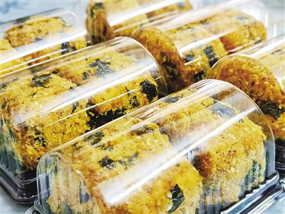 将蛋糕片均分为20片5cm×7cm左右小块,两小块为一对。在两小块中间抹色拉酱后合上,再在整个外部抹色拉酱后沾上肉松,如此重复可做十个肉松蛋糕。