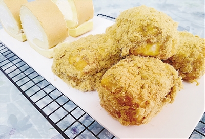 步骤1:虎皮制作:容器内加入蛋黄和细砂糖,手持电动打蛋器打发至浓稠、体积膨胀且泛白,厚稠的面糊滴落不迅速消失;加入玉米淀粉,翻拌均匀;加入玉米油,翻拌均匀;倒入铺好硅油纸的28×28烤盘,面糊表面刮平;入烤箱,200℃至210℃,8分钟左右,注意看状态,不要烤焦。烤好撕掉硅油纸,冷却待用。