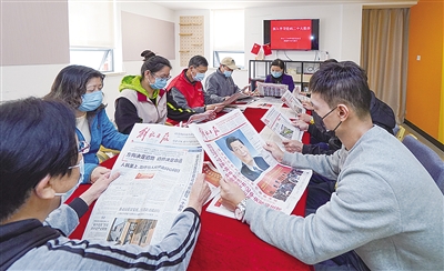 在党的二十大胜利闭幕后,徐家汇街道乐山二三村居民区就开展了相关学习活动。党总支书记余美香整理了各大报纸的相关报道,为大家讲解报纸上的内容,并相互讨论,让二十大精神更加深入人心。