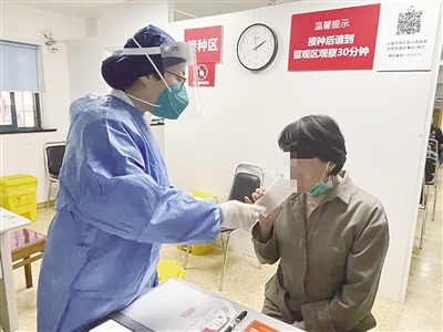 和肌肉注射疫苗的流程一样,准备接种疫苗的市民在入口处依次亮健康码,完成第一步初检。随后经过测血压、预检分诊、信息登记,健康状况询问与接种核查、签署疫苗使用知情同意书和注射等流程,确定适合接受疫苗注射后,才到达接种室接种新冠疫苗。