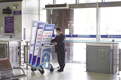 根据12月7日发布的防控举措,位于出口处的核酸检测点位已经关闭,通过测温旅客即可出站。车站的工作人员正在搬离站内原先的告示牌和指示牌(如图),并通过张贴的形式将新的防控措施及时告知旅客。