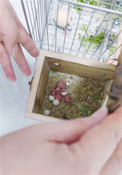 接连生了六颗蛋,蛋壳很坚硬,蛋也不是很大。小小的蛋中孕育着生命。小绿是个“新手妈妈”,这是她的头胎,没什么经验。孵化了一段时间也没什么动静。十八天左右,终于有小生命降临了。小家伙蜷缩着,粉粉嫩嫩,弱不禁风,无法抬头,将头埋在木屑中,有一定的鸟的形态,翅膀很小很细,眼睛朦朦胧胧,是灰黑的。可以看到它淡黄色的嘴。它的整体给人一种弱弱、幼小稚嫩的感觉。就叫它鸟大吧!小绿暖着它,给它喂食。差不多一星期,小鸟开始叫,声音轻脆稚嫩,可以稍微摇摆。喂饱的小鸟肚子鼓鼓的,身体上有“泡泡”,仿佛要撑开一般。小蓝不断奔波给小绿和小鸟喂食,飞来飞去,匆匆忙忙。