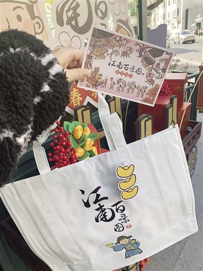 记者在现场看到,许多游客纷纷关注“江南百景图”微博和微信公众号,领取限定明信片和严大人招财手提袋(如图 莎莎 摄),并在明信片上留下自己的祝福和寄语,向远方的家人、朋友寄托相思。此外,游客下载《江南百景图》APP、发布驿站照片,还能获得“冬日雪严香囊”和主题咖啡/红茶饮品。