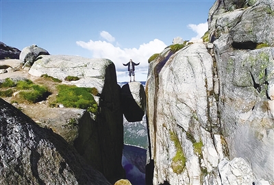 挪威“奇迹岩”,坐落在谢拉格山的顶部,但是并不在山顶,而是坐落在一千米高的峡谷中。它的顶部和两侧的悬崖并没有太大的垂直距离,所以可以让人在悬崖的两侧攀爬而下。虽然这块石头很结实,但要爬上这座高达数千米的山崖,就是最勇敢的人,所以才会被称为“勇者之石”。