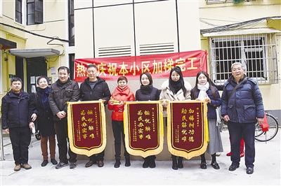 在庆祝电梯启用仪式的现场,居民们自掏腰包拉出了“热烈庆祝本小区加梯完工”的横幅,还分别向湖南路街道房办、湖南路街道华康居委会和承建加梯工程的上海现代电梯工程有限公司赠送了锦旗,以表达楼组居民的由衷“三感激”。作为此次加梯工程的功臣,原华康居委会主任吕曼华惊喜地收到居民们的赠诗一首和精致“奖牌”。一人忙碌为邻家,几多辛苦少闲暇。加梯虽难不畏难,兔年建成乐无涯。吕曼华感慨道:退休前自己的工作目标终于实现了。居民们给了她这么多的惊喜。这是自己退休后继续关心、支持居委工作、继续关心居民生活的动力。