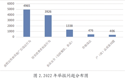 2. 从举报问题来看,排名前五位依次为虚假宣传和其他广告违法行为4965件、侵害消费者权益行为3926件、食品安全(包括餐饮、食品)1338件、价格违法476件、产(商)品质量问题406件,上述五类占举报总量的78%。