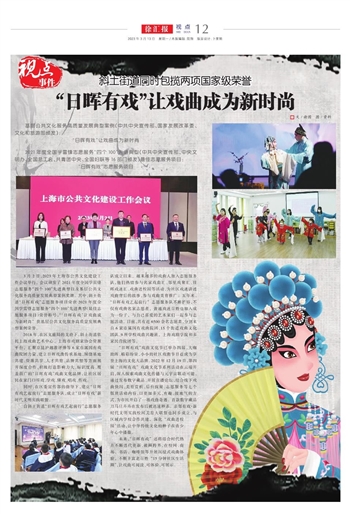 3月2日,2023年上海市公共文化建设工作会议举行。会议颁发了2021年度全国学雷锋志愿服务“四个100”先进典型以及基层公共文化服务高质量发展典型案例奖牌。其中,斜土街道“日晖有戏”志愿服务项目荣获2021年度全国学雷锋志愿服务“四个100”先进典型(最佳志愿服务项目)荣誉称号,“‘日晖有戏’让戏曲成为新时尚”获基层公共文化服务高质量发展典型案例荣誉。