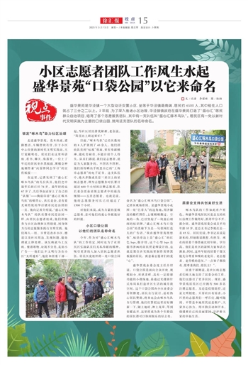 盛华景苑是华泾镇一个大型动迁安置小区,坐落于华泾镇最南端,居民约6500人,其中租住人口就占了三分之二以上。2年前,为了深入推进小区治理,华泾镇镇政府在盛华景苑打造了“盛心汇”居民群众自治项目,培育了多个志愿服务团队,其中有一支队伍叫“盛心汇啄木鸟队”。居民区有一处以新时代文明实践为主题的口袋公园,就用这支团队的名称命名。
