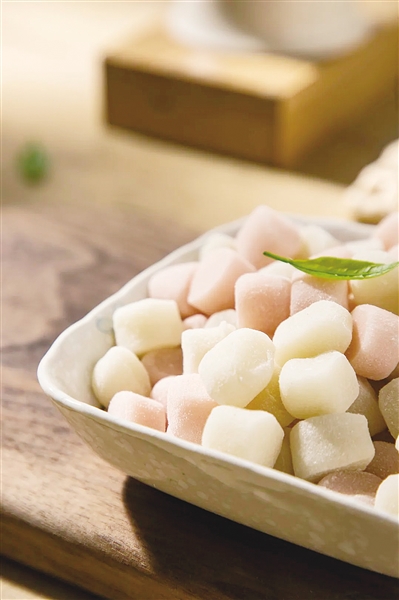 桔红糕又称橘红糕,外表晶莹剔透,入口Q弹香软,糯而不粘,有一股独特的清甜味道,是一款老少皆宜的糕点,寓意“大吉大利”。传统的橘红糕里,必有金桔入糕,金桔得蜜饯或糖渍过,褪去青酸却保有清香,和入糯米中混合出独特的清甜味道。