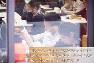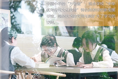 中国中学契合学校“中华优秀传统文化教育”特色创设了新型图书馆“万卷堂”,为引导学生喜欢阅读、学会阅读,学校从满足学生身心发展新需求、适应现代学习新样态、跟上科技发展新步伐三个角度出发打造空间,内置原木家具,温馨舒适,符合学生审美情趣。除纸质书籍外,万卷堂还放置了电子化阅读的墨水屏,学生可以进行记录和批注,可以进行小组分享和研讨,教师可以进行即时点评和反馈,媒体技术的支持无限扩大了学习的空间。语文、英语等学科相继在此空间开设阅读课。