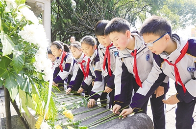 3月27日上午十时许,天气晴朗,暖阳高照。位于华泾路1018号邹容墓前,庄严肃穆,上海烈士纪念设施守护崇敬志愿服务队徐汇支队组织的祭奠活动正在举办。当天上午,由区退役军人事务局、海军某消磁站、华泾镇、枫林街道社区卫生服务中心、上海才众餐饮公司、高安路一小等单位领导、老师、战士、学生们,怀着崇敬的心情,祭奠民主革命先驱邹容,向邹容墓碑三鞠躬,并献上鲜艳的菊花。