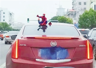 近日,市民丁先生行驶在杨高中路高架靠近云山路附近时,他发现前方行驶的车辆车身顶上蹲着一团不明物体,仔细看才发现是“蜘蛛侠”的玩偶。