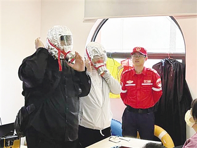 “防毒面具要这样戴到位,不然浓烟还是会进入面具内,那就很危险了。”为加强参与人员的体验感,帮助大家活学活用,教员设计了多种灾害影响场景,居委干部和居民们自行选择相应的体验教具。