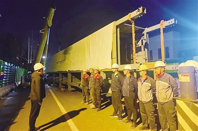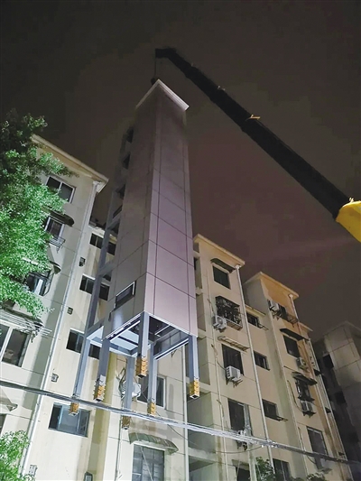 随着大型吊机上的吊钩缓缓下降,康乐小区11号和13号楼16.8米长的一段式整体装配电梯顺利吊装完成!