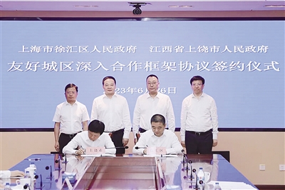 为全面贯彻落实党的二十大精神,进一步落实区域协调发展战略,6月26日上午,徐汇区人民政府与上饶市人民政府正式签署友好城区深入合作框架协议。徐汇区委书记曹立强、上饶市委书记陈云出席签约仪式并讲话,徐汇区委副书记、区长钟晓咏,上饶市委副书记、市长邱向军分别代表双方签署协议。徐汇区委副书记沈权,区委常委、副区长俞林伟,副区长罗华品,上饶市委常委、组织部长任海斌,副市长郭峰,市委秘书长孔先锋,市政府秘书长毛祖宾等参加活动。 刘坤 陈文卿 摄影报道