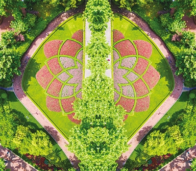 襄阳公园内的精巧布局构筑了一座别具特色的法式公园。既有规则式布局,也有自然式布置,在两者中的空间,利用绿篱分隔,产生小中见大的效果。公园的中轴线是一条南北向的宽阔大道,两旁高大虬劲的悬铃木浓荫蔽日。道路两侧有法国式轴对称几何形的花坛,种植四季花卉。