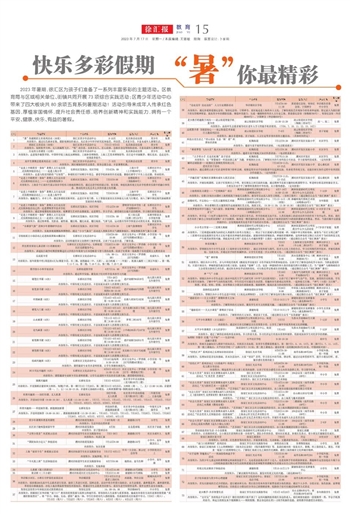 2023年暑期,徐汇区为孩子们准备了一系列丰富多彩的主题活动。区教育局与区域相关单位、街镇共同开展73项综合实践活动;区青少年活动中心带来了四大板块共80余项五育系列暑期活动!活动引导未成年人传承红色基因,厚植家国情怀,提升社会责任感,培养创新精神和实践能力,拥有一个平安、健康、快乐、有益的暑假。