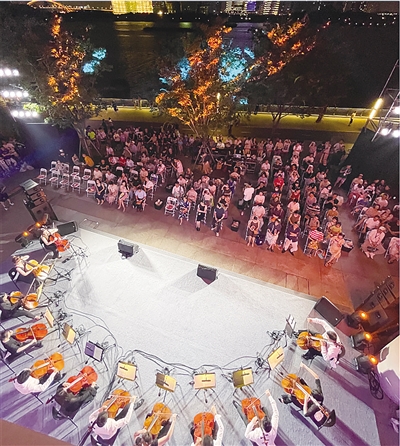 夜晚,江风摇曳,充满现代气息的西岸美术馆户外广场传来悠扬琴声。上海交响乐团大提琴重奏组的演奏家们将皮亚佐拉、李斯特、格什温、维拉-洛博斯,带到这片市民钟爱的艺术之地。为市民奏响城市夏音,这也是继在上海城市草坪音乐广场深耕多年后,上海夏季音乐节再次拓展户外演出版图,和徐汇滨江梦幻联动。